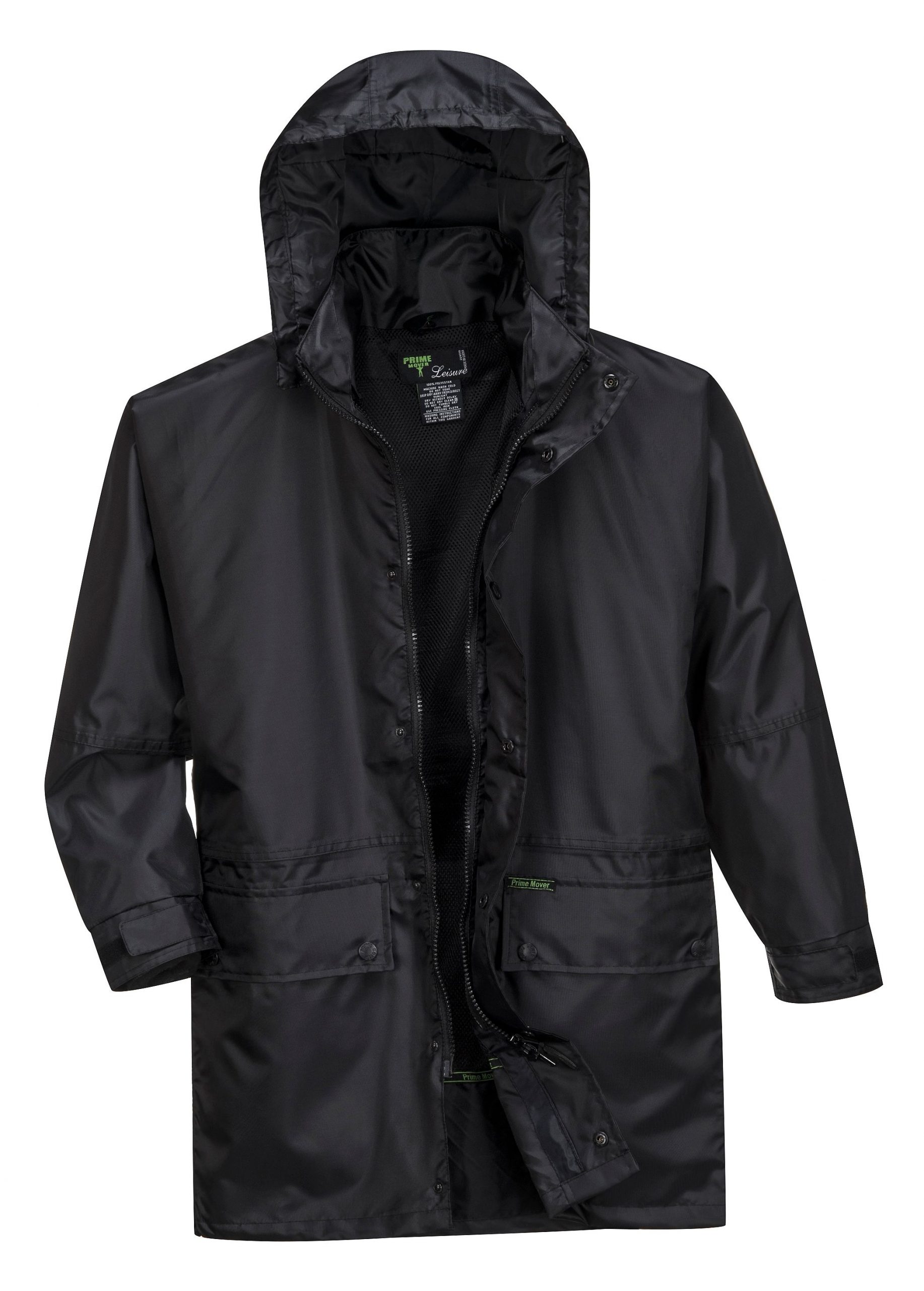 Waterproof Rain Jacket with detachable waterproof hood. Heat Seam Sealed Oxford Waterproof shell and lightweight mesh lining with storm cuff. Plastic zip closure with reinforced button snap closure. Deep external waist pockets with plastic button closure and internal embroidery pockets. Back splits for cool summer use and additional back ventilation flap.