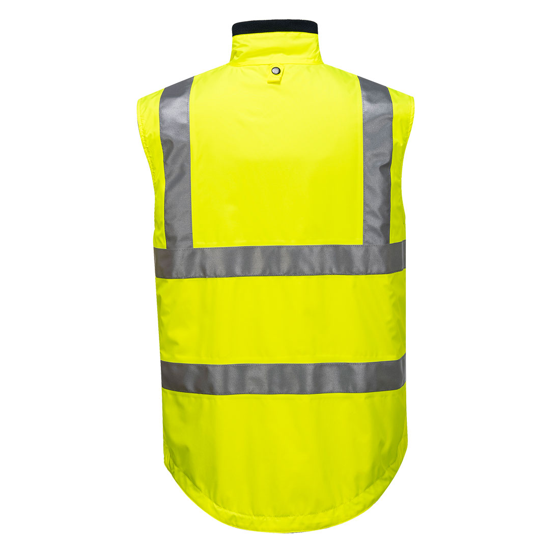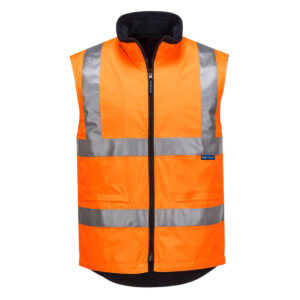 Hi-Vis Polar Fleece fully reversible vest with Heat seam sealed Oxford waterproof shell. Tough plastic zipper closure and Velcro Closures on embroidery pockets. Reflective tape around body and over shoulders (not on navy side). Makes a 4-in-1 set when zipped into any Shell Jacket.